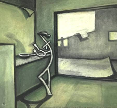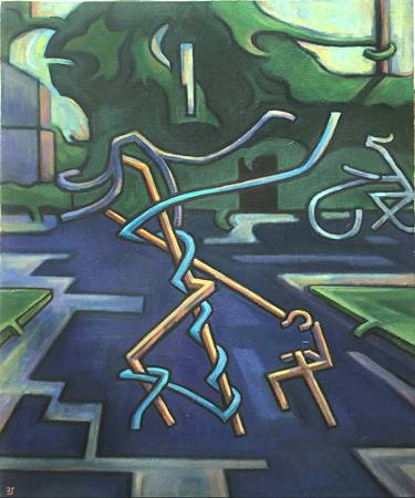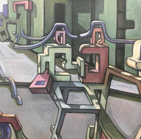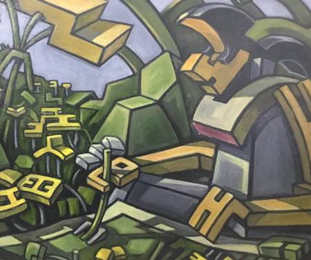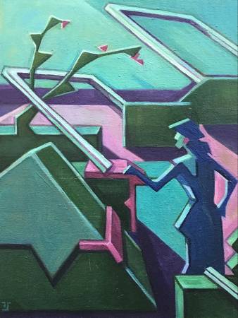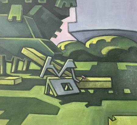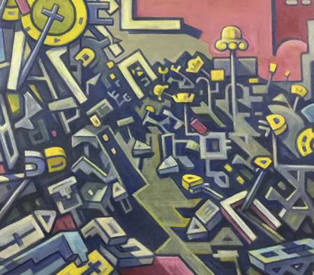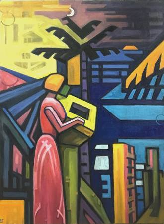 Careful analysis of works reveal surprising ideation. ‘Choral Rain’ depicts a dancing girl against a metropolitan skyline as a storm picks up. Windows pour light and highrises flex, demonstrating ‘transposable behaviour’, a key Yufist tenet. Water beads arrange themselves at the girl’s feet in a necklace pattern making the rain ornamental. In ‘Wheat Field Mynah’ paying homage to Van Gogh, the sky is structured into blocks upon which clouds rest.